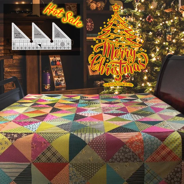 Use the straight side of this double strip ruler to cut 1 ½" and 2 ½" strips or use the pre-cuts that are on the market. Sew these strips together to create a 4 ½" wide strip set. Turn-a-Round the ruler to cut multiple shapes that finish 4". Multiple layers can be cut at the same time.