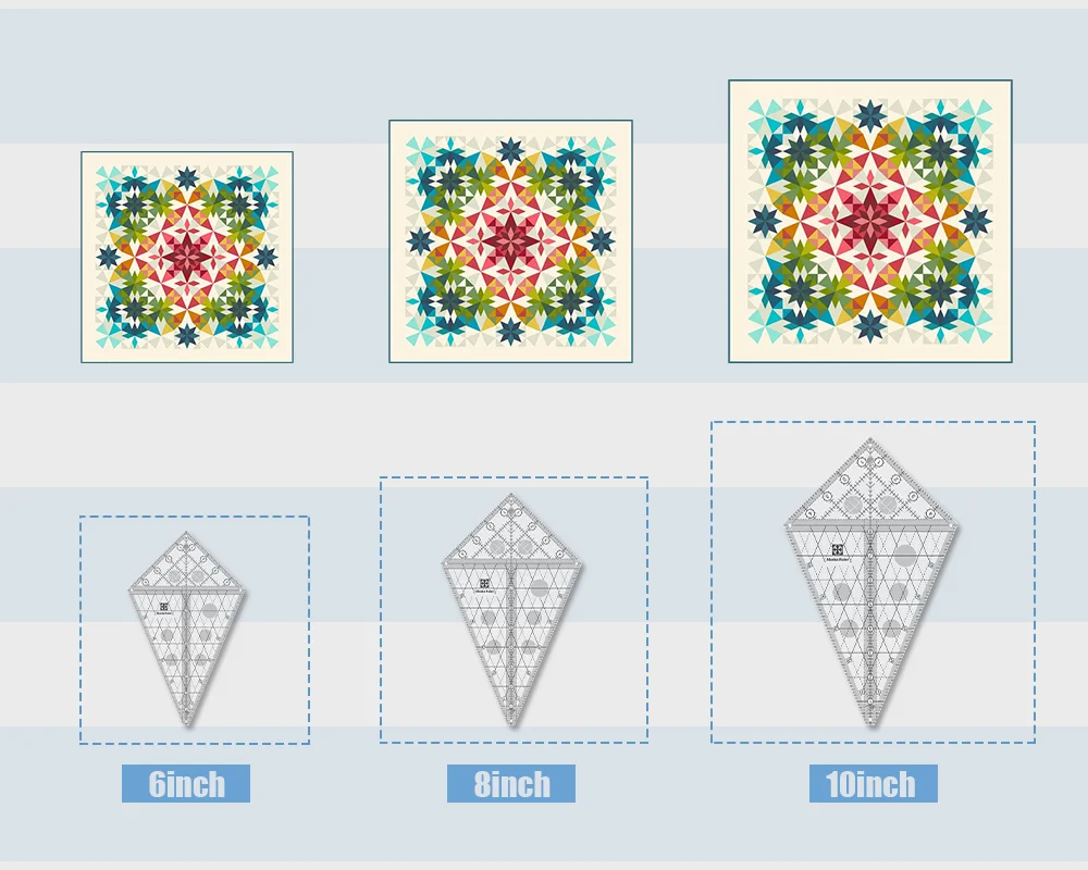 Alaska Ruler, cuts a multitude of shapes in a variety of sizes. Cut 45° wedges, diamonds, squares and half-square triangles all with the same ruler!