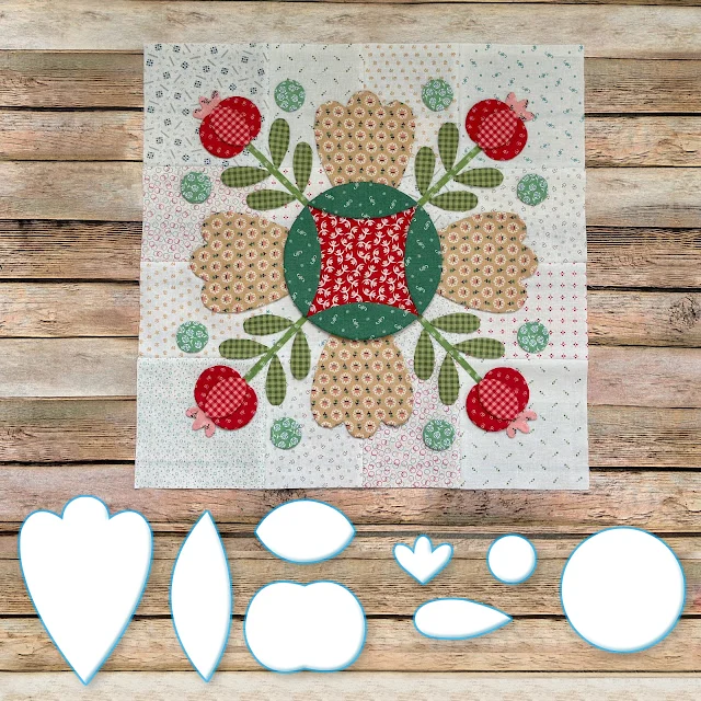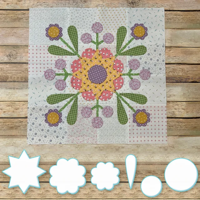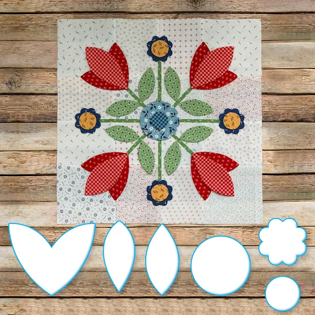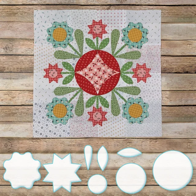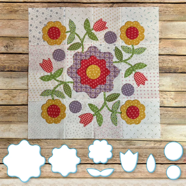 We will be making the Prairie Meadow Quilt which finishes at 68" x 85" It has twelve appliquéd blocks which we will be using my Sew Simple Shapes to make...and there are sashings between the blocksand pieced border blocks around the entire quilt that are rotary cut and sewing machine pieced. Each Prairie Block without the block borders finish at 16" x 16"